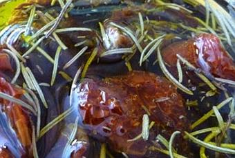Pasado este tiempo los echamos al escurre verduras y los dejamos escurrir bien. A continuación los echamos en una fuente bien esparcidos y los secamos un poco con papel absorbente. Dejamos enfriar muy bien. En un tarro ponemos los tomates, el tomillo y el romero, los ajos pelados y lo cubrimos todo con aceite de oliva.