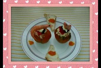 Esta receta es una receta que en casa nos encanta sobre todo con unos tomates así exquisitos. INGREDIENTES: 4 tomates raf http://www.peperaf.com/es/ Una cola de rape 2 medallones de merluza 100 gr de langostinos cocidos Surimi Un cogollo Unas alcaparras Una lata de atún Mahonesa Para decorar Sucedáneo de caviar rojo y negro y crema de queso con trufa blanca http://www.canariaecogourmet.com/ De acompañamiento unas totas de pan de molde con crema de queso con trufa blanca y confitura de pimiento naranja http://www.tribelli.com/ ELABORACIÓN: En una cazuelita herviremos con un chorrito de aceite de oliva y sal la cola de rape y los medallones de merluza. Retiramos y escurrimos reservamos hasta que este frio para poderlo desmenuzar, mientras tanto lavaremos los tomates y los secaremos vaciaremos los tomates y reservaremos en un bol la pulpa para añadirlo al relleno. Desmenuzaremos el pescado y lo añadiremos al bol donde tenemos la pulpa del tomate añadiremos los langostinos pelados menos unos pocos para decorar, a trocitos añadiremos el surimi, el atún, las alcaparras y el cogollo cortadito en juliana la mahonesa y mezclamos todo bien rellenamos los tomates y decoramos con sucedáneo de caviar y una cucharadita de crema de queso con trufa blanca y un langostino.