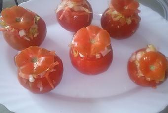 En un bol ponemos la pupa que le quitamos a los tomates añadimos el resto de ingredientes picados muy pequeños salpimentamos mezclamos todo y rellenamos los tomates que habiamos reservado