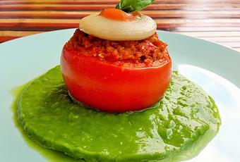 - Servimos en platos hondos con la crema de guisantes y el tomate en el centro.