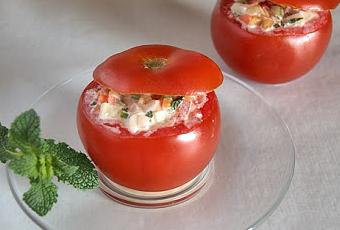 Ingredientes para cuatro tomates Cuatro tomates maduros 125 gr (una terrina) de crema de queso Una cucharada colmada de pimiento rojo picado Una cucharada colmada de pepino picado Una cucharada colmada de cebolla dulce picada Una cucharada colmada de zanahoria picada Una cucharada colmada de apio picado Cuatro nueces picadas Dos cucharadas de yerbabuena picada Una cucharadita de estragón Pimienta Sal