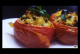 Tomates rellenos de cuscús, ingredientes:4 tomates canarios, o de rama150 gr de cuscús, caldo de verduras.1/2 cebolla, unas hojas de menta fresca.3 cucharadas de guisantes.3 cucharadas de yogur griego o natural.2 cucharadas de curry en polvo.1 cucharada de canela en polvo.1 cucharada de margarina.50 gr de pasa, aceite de oliva virgen.