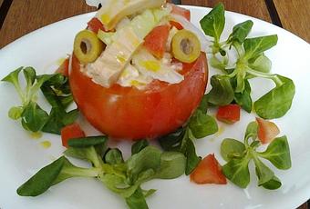 Ingredientes:4 tomates para ensalada grandesuna lata de bonito2 patatas medianas2 huevos cocidos duros75 gr de variantes en vinagre6 cucharadas de mahonesaunas hojas de lechuga12 aceitunas rellenassalPreparación:Lavar las patatas y cocer en abundante agua con sal durante 15 a 20 minutos. Cocer también los huevos durante 10 minutos.Cortar la parte superior de los tomates, y vaciar el interior, retirando la pulpa y colocar los tomates boca abajo para que pierdan el agua que les pueda quedar.