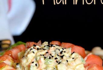 - En una fuente o en un plato montar un lecho de lechugas, poner encima los tomates y rellenar con la mezcla que habíamos preparado. Finalizar con un chorrito de aceite y decorar con unas semillas de sésamo o una anchoa.
