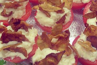 Para hacer el puré, ponemos agua con sal a hervir, lavamos y pelamos las patatas, las cortaos en trozos y las cocemos hasta que estén tiernas (unos 15 min. a fuego medio-fuerte). Machacamos o trituramos la patata hasta hacerla puré, incorporamos el aceite y la sal y mezclamos.Sacamos el seitán del congelador y dejamos escurrir los tomates.Preparamos el alioli batiendo los ingredientes y lo mezclamos con el puré. Vamos rellenando con esa mezcla todos los tomates.Cortamos el seitán con un pela-patatas o un cuchillo afilado en láminas muy finas y las freímos unos segundos en aceite muy caliente. Dejamos escurrir en papel absorbente y las ponemos como decoración sobre el puré. Colocamos los tomates en una bandeja y los decoramos con el el perejil o la lechuga rizada.Se sirve frío como primer plato o entrante.