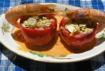 Con el día que nos ha salido hoy en Asturias, el termómetro ha llegado a los 31º lo mejor una comida fresquina, fresquina.......... La idea la tomé de una revista porque lo que es el relleno, fue improvisado con lo que tenía de sobras. A mi me gusta mucho el tomate y desde que probé el salmorejo lo tomo tanto en verano como en invierno. Aunque este plato es mas propio para esos días sofocantes de verano sobre todo se está bien fresquito. El relleno digo que es completamente improvisado porque no he seguido la receta, tenía unos huevos rellenos (bonito y mayonesa), a los que añadí las gambas y con eso fue con lo que los rellene. Pero que igual el huevo, bonito y mayonesa por separado también puede servir. Lo que saque del interior del tomate lo aproveché para hacer un sofrito. Así que doble aprovechamiento en cadena jaja.