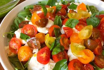 - Lavo los cherries y los pongo encima de una capa de rúcula, junto con la burrata y hojitas de albahaca. Acompañala con la salsa de albahaca. Cada uno se ponga lo que quiere