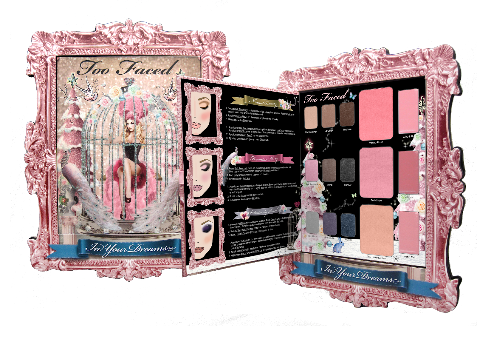 Este estuche consta de:- Nueve sombras de ojos desde los colores más claros a los más oscuros.- Tres coloretes para una tez resplandeciente.- Tres brillos rosados.- Tres lecciones paso a paso para un resultado perfecto.Precio: 44,90Sweet DreamsEsta paleta exclusiva con diseño de cuento de hadas guarda tesoros de belleza. Contiene todos los productos indispensables de Too Faced para un look que hace soñar:
