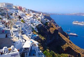 Ya sea que vuele o tome el ferry desde las otras islas, es imposible perderse la sorprendente vista de la caldera (cráter volcánico) y sus capas de lava, en su mayoría visible desde pintorescos asentamientos en lo alto de acantilados. Las ciudades encaladas de Firá y Oia son algunos de los destinos más atractivos para visitar en la isla. Entre las dos ciudades, pequeños pueblos se aferran a los acantilados, ofreciendo entornos más tranquilos y relajados para sus vacaciones.
