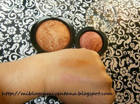 Bronzer deja acabado luminoso en color cobre anaranjado con reflejo dorado, y el colorete es rosa coralino con reflejo rosado/plateado, más sutil.