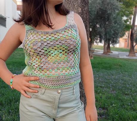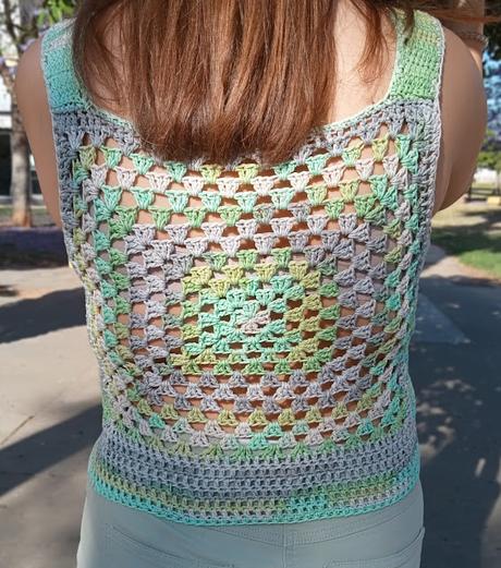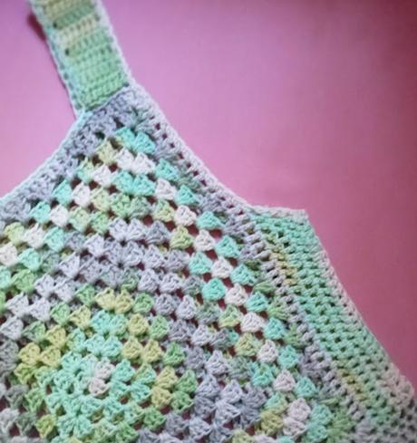 Dos cuadrados grannies, ambos rematados con una vuelta de puntos altos. Posteriormente, en los laterales seguimos tejiendo puntos altos para formar la sisa. Y por último, tejemos tirantes y alargamos con vueltas de puntos altos. Pulimos escotes, sisas y bajos y listo.