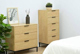 Cada pack de dormitorio está formado por un conjunto de mobiliario que puede incluir mesitas de noche, cómoda o sinfonier, con acabados coordinados y una estética unificada. Algunos modelos incorporan variantes como mesitas de uno o dos cajones, según la capacidad de almacenaje requerida. En todos los casos, el diseño busca mantener una imagen coherente, permitiendo completar el dormitorio con piezas adicionales disponibles por separado, como cabeceros, armarios, lámparas o elementos textiles.