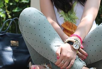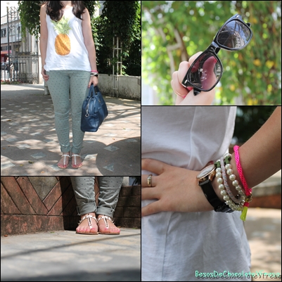 Los combiné con la camiseta de piña, sandalias blancas de pinchos dorados tambien de las rebajas y bolso en azul marino, a juego con los topos del pantalón.