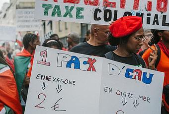 Fuentes: Basta! [Foto: Una mujer lleva una pancarta en la que se lee "Precio de un paquete de agua en Francia 2 euros, en "ultramar" 8 euros", en referencia a la situación en Martinica (Hervé Chatel - Hans Lucas)]