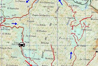 En San Salvador cojo la carretera que sube con rumbo SO hacia LA SOMOZA (Barrio, Torce y Cuña). Por ella avanzo entre los praos de Caranga, El Covachu, Navona, Las Veigas, Fontescalientes y Los Cazones yendo paralelo al río Barriu