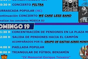 El domingo será el tiempo de la salida de los pendones en la plaza mayor que se trasladarán hacia el campón acompañados de el grupo de gaitas Aires Mineros. A mediodía Paellada popular y el triangular de fútbol benjamín, a las 19 horas merienda popular y se cierra la jornada al ritmo de La Hora Bruja.