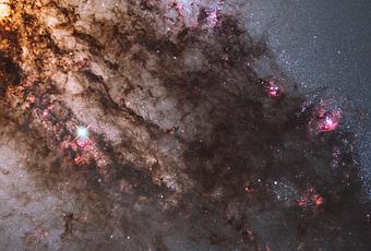 La forma distorsionada del disco de gas y polvo de Centaurus A es la evidencia de una colisión y fusión en el pasado con otra galaxia. Las ondas de choque resultantes provocan nubes de gas de hidrógeno para comprimir, lo que provocó una tormenta de formación de nuevas estrellas. Estos son visibles en los parches rojos en este primer plano del Hubble.