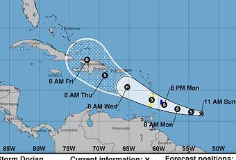 El lunes o en la madrugada del martes el ojo de Dorian se ubicará próximo a las Islas Barlovento, Antillas Menores.