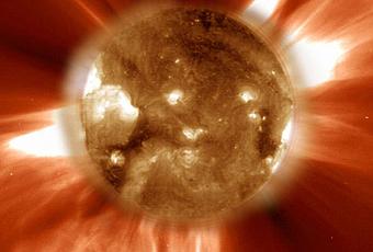 La sonda SOHO que orbita el Sol ha fotografiado numerosos filamentos en erupción que se elevan de la superficie solar así como enormes burbujas de plasma magnético que estallan hacia el espacio. Estas explosiones, llamadas eyecciones de masa coronal, fueron descubiertas a principios de los años 70. En la parte interior de la fotografía, hecha en 2002, la luz directa del Sol es bloqueada y sustituida por una imagen simultánea del Sol en luz ultravioleta. El campo de visión abarca más de dos millones de kilómetros de la superficie solar. La espectacular fotografía es parte de un registro detallado de esta eyección de masa coronal realizado actualmente por la SOHO. Cerca del máximo del ciclo de actividad solar, como las eyecciones se producen normalmente varias veces por semana. Las eyecciones más fuertes pueden influir considerablemente en el clima espacial; las que se dirigen hacia nuestro planeta pueden tener graves repercusiones.
