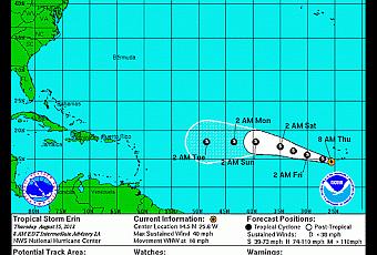 Se ha formado la tormenta tropical Erin, conforme al boletín de las 8 de la mañana del Centro de Huracanes de Estados Unidos. Trae vientos de 65 kilómetros por hora hora.