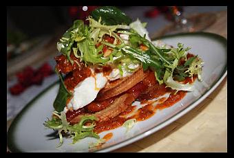 los ingredientes para dos personas son;unas cucharadas pequeñas de pesto rojo (yo lo compré, pero tambien lo podeis hacer muy facil vosotros; aqui os dejo una receta)12 rajas finas de una barra de panun poco de de aceite de oliva10 tomates cherry1/2 cebolla roja1 bola de mozzarellaunos brotes de ensalada (yo usé una mezcla con rucola y espinacas)2 cucharadas pequeñas de azúcar1 cucharadas pequeñas de miel1 cucharada sopera de vinagre modenasal y pimienta1 cucharada sopera de zumo de limaPrecalentamos el horno a 180°C y vertimos un poco de aceite por encima de las rajas de pan. Ahora las metemos unos 5-10 minutos en el horno hasta que se pongan un poco doradas y crujientes. Mientras el pan este en el horno cortamos los tomates cherry en quartos, la cebolla en julianas y el mozzarella en rajas.Los tomates y la cebolla echamos en una sartén con un poco de aceite y las rehogamos con el azúcar y la miel, al final echamos el vinagre y esperamos hasta que se absorba. Luego sazonamos con sal y pimienta y retiramos la sartén del fuego.Ahora ya podemos construir nuestra torre; empezamos con unas cucharaditas de pesto como base en el plato y sobre ello colocamos 3 rajas de pan crujiente. Por encima del pan vertimos la mitad de tomate con cebolla y sobre ello colocamos otras tres rajas de pan. Ahora toca a la mitad del mozzarella y acabamos con unos brotes de ensalada y unas cucharaditas de pesto. Al final echamos unas gotas de zumo de lima por encima de todo y ya esta lista nuestra torre y podemos construir la segunda.Que tal os parece? Espero que se vea bien en las fotos, que hice muy pocas al final.