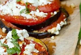 Luego, en otro molde poner una rodaja de berenjena, una de tomate (en total son 3 tomates grandes en rodajes), 450 gr de queso crema, albahaca fresca y así hasta terminar con tomate, queso y albahaca.