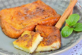 Cortamos el pan en rebanadas de un dedo de grosor aprox., y las vamos mojando una a una en leche hasta que estén empapadas. Las escurrimos un poco con las manos (si tiene demasiada leche, luego salpicará mucho el aceite).