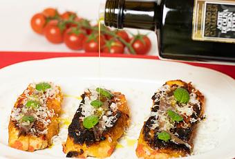 Cuando estén tostaditas, las sacamos y emplatamos, con una anchoa, le rallamos el queso elegido, y adornamos con unas hojitas de albahaca. Terminamos con un hilo de aceite de oliva virgen extra. ¡QUE APROVECHE!