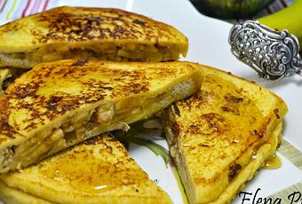 - Mezclamos en un pequeño bol las rodajas de plátano con las nueces picadas. Distribuimos la mezcla entre cuatro rebanadas de pan, dejando libre un pequeño espacio a lo largo de los bordes. Colocamos encima el resto de rebanadas a modo de sándwich, apretando bien el pan.