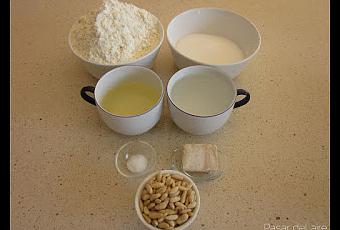 - Espolvorear con una capa de harina, un chorro de aceite repartido por encima de la harina y el azúcar. Volver a repetir la operación. Repartir los piñones por la superfície.