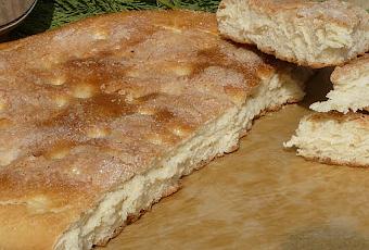 Una vez estirada la colocamos en la bandeja del horno sobre papel de hornear.Con los dedos marcamos unos agujeros, pincelamos la torta de leche( tiene que quedar leche por los agujeros) y espolvoreamos el azúcar por encima, dejamos levar media hora. Metemos al horno a 190º 25 minutos o hasta que esté dorada.Sacar de horno y dejar enfriar en una rejilla, cuando este totalmente fría ya la podemos comer, aunque yo soy una impaciente y me comí un trozo, bueno dos al poco de sacarla del horno. Por eso no os puedo poner la foto de la torta entera,joooo.Para que os hagáis una idea me salio una torta con 10 porciones como las que veis en la foto.