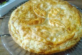 Humedecemos este anillo con agua y lo cubrimos con la segunda base redonda, unir ambos presionando con los dedos, humedecer de nuevo el borde, y envolver retorciendo la base inferior sobre la que la recubre con los dedos. Pintar con huevo batido y adornar con motivos cortados de las sobras de hojaldre.