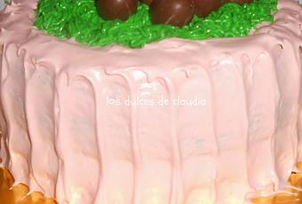 Ingredientes:1 taza de leche1 cucharada de vinagre1 y 1/2 tazas de harina con levadura incorporada (preparada)1 taza y 1/4 de azúcar3/4 taza de aceite1/2 taza de cacao amargo 1 cucharadita de esencia de vainilla1 y 1/4 cucharaditas de bicarbonato1/4 cucharadita de sal2 huevosPrecalentar el horno a 180ºCtodo a temperatura ambientetazas de reposteríaPreparación:Tamizar el harina, cacao, bicarbonato y la sal.Mezclar la leche con el vinagre, reservar 10 minutos.Batir el aceite, huevos, vainilla y azúcar hasta formar una crema.Dejar de batir y alternar los ingredientes secos con la leche con unas varillas.Enmantequillar y enharinar los moldes.Hornear 35 minutos.Solo utilicé dos discos de bizcochos.Rellenar.Como solo necesitaba un poquito de buttercream, antes de poner la crema de marshmallow separé un poquito y lo teñí de verde para hacer el césped.