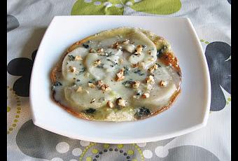 Ingredientes y receta de torta de anís con queso azul, pera y nueces: