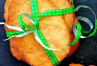 - Ponemos las bolas entre dos papeles de hornear y pasamos el rodillo hasta dejarlas muy finitas. De allí con la palma de la mano la pasamos por la bandeja de azúcar y la colocamos en una bandeja de horno con el azúcar hacia arriba.