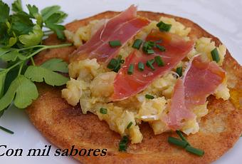 Preparación:Desalar el bacalao, cambiándole varias veces el agua, durante unas horas.Poner en una sartén un poco de aceite de oliva y cuando esté en su punto sofreír la cebolla rallada. Desmigar el bacalao y añadírselo a la cebolla doradita, sofreír hasta que el bacalao esté en su punto y reservar.Montar las tortas justo en el momento de servir(para que no pierdan el toque crujiente), colocar un poco del sofrito de bacalao sobre cada torta, coronar con unas tiras de jamón serrano y espolvorear con un poco de cebollino picado ó en su defecto un poco de perejil.Tiene un bocado exquisito y os encantará la combinación de sabores.Buen provecho amigos!!!.