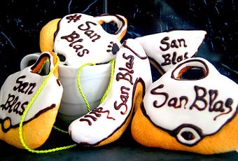 Y por último, una vez que la glasa esté dura, se funde el chocolate de cobertura al baño maría o al microondas, con mucho cuidado para que no se queme y con un biberón pequeñito, una manga pastelera o un cucurucho de papel, se suele escribir "San Blas" en ellas.