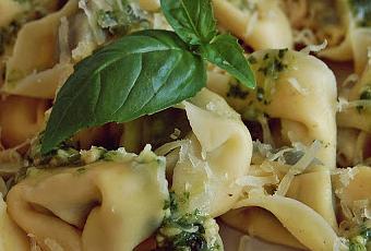 Se coloca la pasta en un plato y se salsea con el pesto. Se le ralla queso por encima y se decora con una hoja de albahaca.