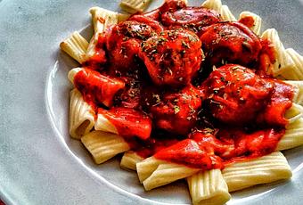 Una vez pelados los estrujamos con la mano hasta soltar todo el agua que le sobra, y troceamos con cuchillo y lo ponemos a freír en una sartén con aceite de oliva, una pizca de sal y una cucharadita de azúcar, y dejamos pochando, cuando el tomate comience a parecerse una salsa, lo batimos y pasamos por un chino para que nos quede una salsa muy fina, ahora lo ponemos en un bol y le echamos un puñado de orégano, removemos y dejamos reposar.