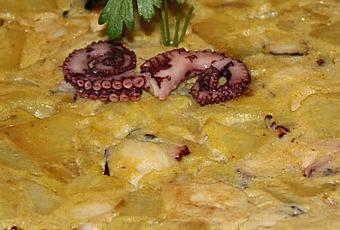 Como había guardado las puntitas rizadas de los tentáculos, pude decorar con ellos la tortilla. Por supuesto la servimos en la madera del pulpo, para que fuera una auténtica Tortilla a Feira... Muchas gracias Luis por tan buena idea, ya ves que la he hecho hoy mismo, y realmente estaba buenísima. Ha sobrado un poco... ¿Quien la quiere probar?