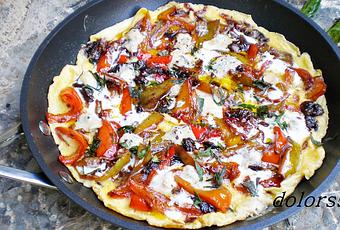 Ingredientes para 4 personas:1-2 pimientos carnosos verdes1-2 pimientos rojos4-6 tomates secosSal, pimienta negra4 huevosUn chorrito de leche (unos 50cc.)Queso roquefort albahaca moradaAceite de oliva virgen extraPoner a hidratar los tomates con agua, al menos un par de horas. Lavar y cortar a tiras los pimientos, ponerlos en una sartén con aceite, salar y freír a fuego medio-bajo durante unos 20 minutos. Añadir los tomates hidratados escurridos y cortados, rehogar todo junto un par de minutos. Reservar y escurrir.