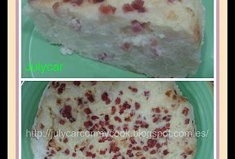 Poner la coliflor sin descongelas dentro de la cubeta de la GME, añadir un poco de agua y sal, tapar con valvula cerrada, menu press, 130º, presión I, 5 minutos, cuando termine despresurizar manualmente, escurrir y reservar, en un bol poner la tarrina de queso, el queso rallado, los huevos, las claras, la nuez moscada, la pimienta y batir todo muy bien, ahora mezclar la coliflor y los taquitos de jamón serrano, reservar un poco de jamón. pincelar la cubeta con aceite de oliva, añadir la mezcla, echar por encima el jamón reservado, poner la tapa doradora y programar la olla, menú plancha 140º, 10 minutos, tapa doradora 250º, 10 minutos (trabajan juntas al mismo tiempo), cuando termine apagar y dejar enfriar dentro antes de desmoldear