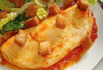 Cuando notéis algo de temperatura en el aceite ya podéis echar el huevo. Distribuir un poco por la sartén. Poner en el centro dos cucharadas colmadas de tomate y la loncha de queso. Con una espátula doblar hacia adentro los laterales. En este caso, como es una tortilla pequeña, solo la he doblado una vez y luego le he dado la vuelta para sellar.