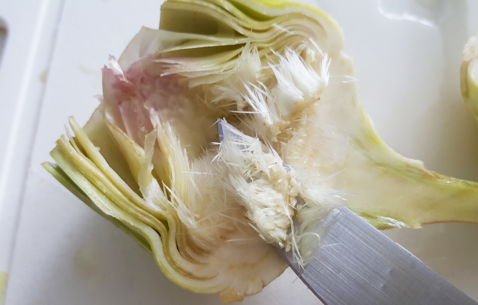3. - Las cortando en 2 mitades y con la punta de un cuchillo le quitamos las "pelusillas" que tienen en el centro y las vamos echando en el agua para que no se pongan negras.