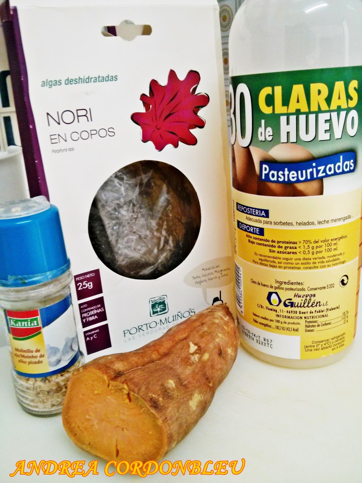 Medio boniato cocido2 claras de huevoMolinillo de ajo en polvoAlga nori en copos (Portomuiños)