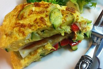 Se engrasa un poco una sartén mediana y se cuaja la mitad de la mezcla de huevos y verduras. Debe quedar una tortilla fina. Se le da la vuelta con un plato o tapadera para que se haga por el otro lado.