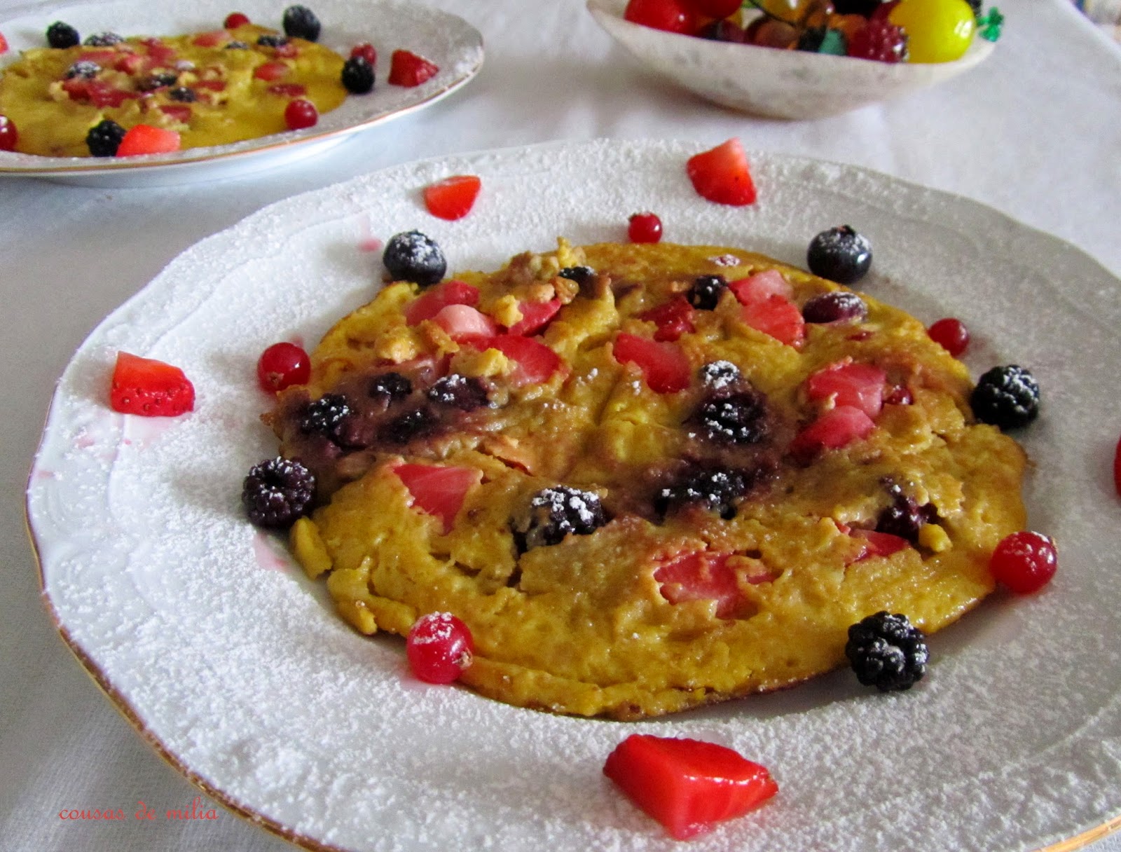 He crecido en una casa donde jamás se tiraba nada... todo tenía una segunda oportunidad, aunque tengo que confesar que no siempre eran de mi agrado... pero algunas si. Y una de ellas era una tortilla de pan dulce que mi madre preparaba de vez en cuando... estuve mucho tiempo sin tomarla, pero un buen día se me ocurrió hacerla... y me gustó, pero me pareció que necesitaba algo que le diera otro aire; como me encantan los frutos rojos y en aquel momento tenía... decidí probar, el sabor conseguido me gustó, el aspecto no tanto...