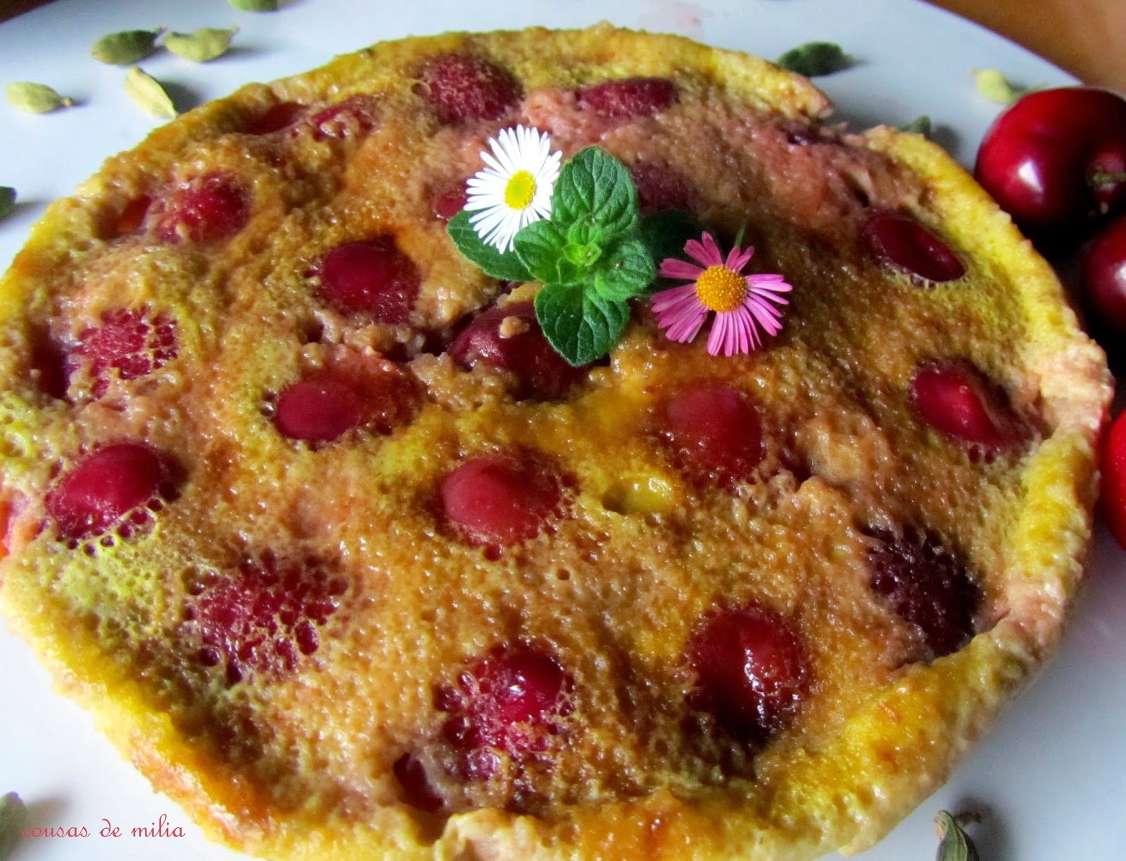 60 ml de leche (la mía desnatada)1 tacita de cerezas1 huevo1/2 cucharadita de cardamomoAzúcar para espolvorearMantequilla o aceite para el moldePreparación:Remogamos el pan en la leche durante un ratito (dependerá de lo duro que esté). Yo no puse azúcar, pero mi madre si se lo ponía a la leche.Cortamos las cerezas a la mitad y retiramos la pepita.Preparamos un molde o incluso un plato hondo, apto para microondas, untandolo con una pizca de mantequilla o aceite suave, si es de silicona ya no hace falta.Batimos el huevo, lo añadimos al pan remojado, ponemos el cardamomo u otra especie (mi madre ponía canela), vertemos la mezcla en el molde, repartimos las cerezas y metemos en el microondas tapado. Está listo en 3-4 minutos. Dejamos que enfríe un poco en el molde.Espolvoreamos azúcar a gusto.