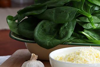 Añadir toda la espinaca cortada y cocinar durante unos 15 minutos, mezclando esporádicamente. - Pelar y picar 2 dientes de ajo y añadirlos a la sartén.