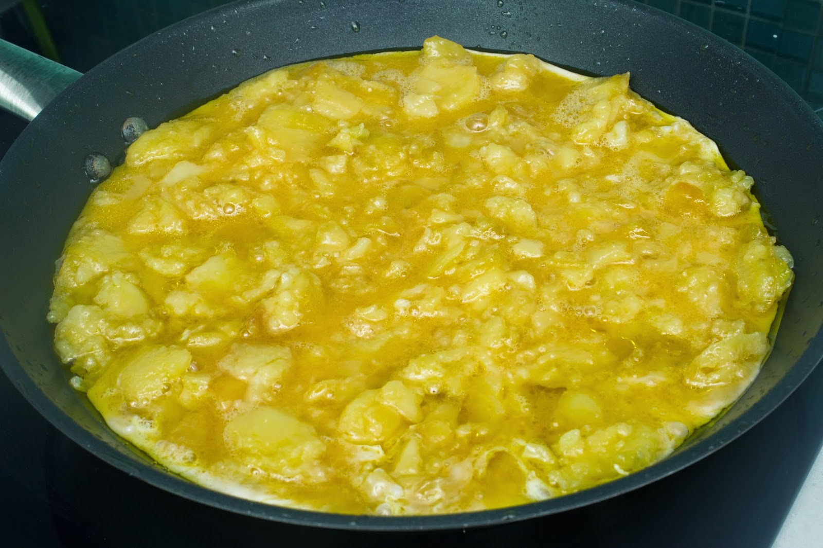 Vacía de aceite la sartén anterior y pon un poco de aceite nuevo. Cuando esté caliente echa la mezcla en ella y deja que se haga por ese lado.